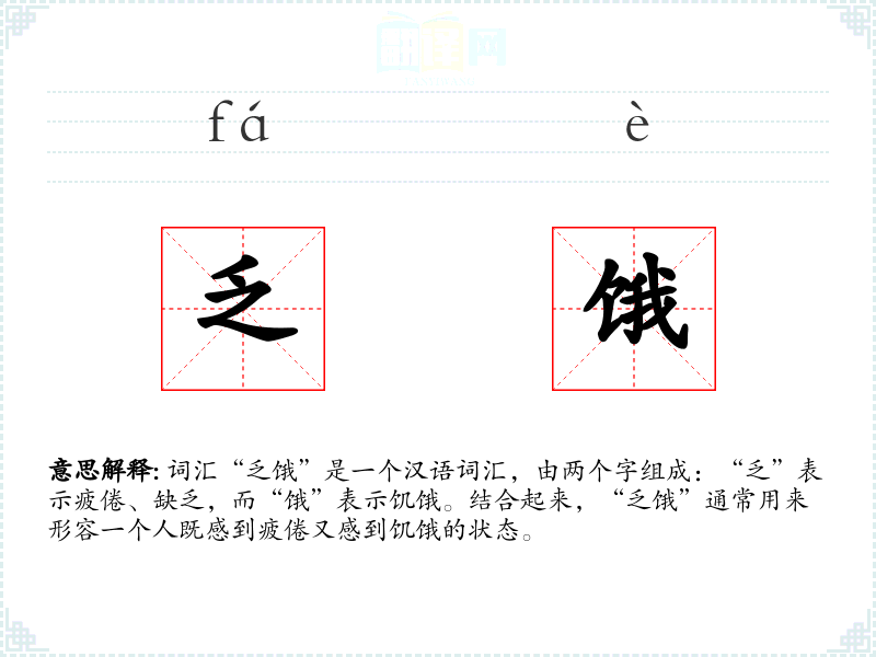 词汇“乏饿”是一个汉语词汇,由两个字组成:“乏”表示疲倦、缺乏,而“饿”表示饥饿。结合起来,“乏饿”通常用来形容一个人既感到疲倦又感到饥饿的状态。