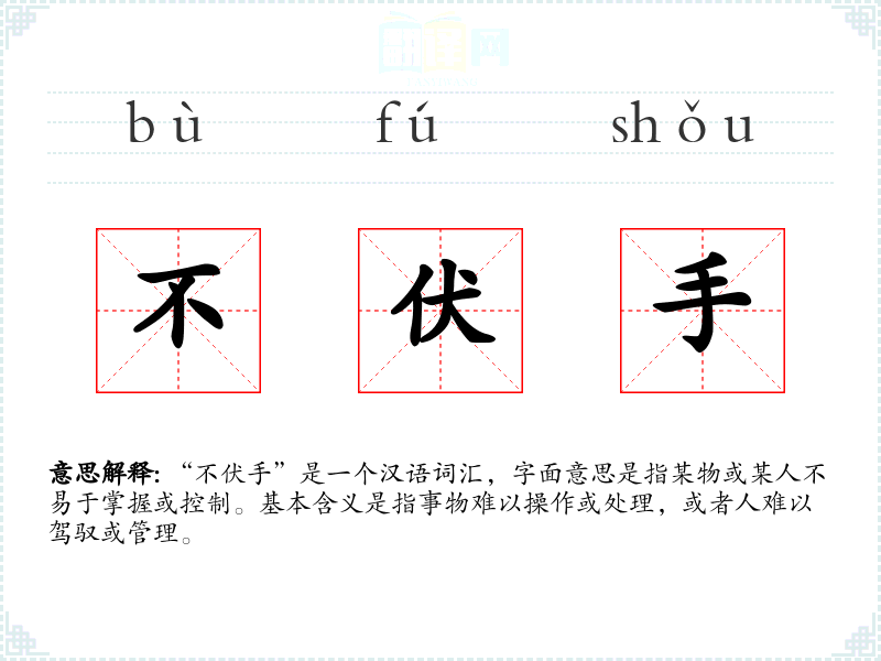 “不伏手”是一个汉语词汇,字面意思是指某物或某人不易于掌握或控制。基本含义是指事物难以操作或处理,或者人难以驾驭或管理。