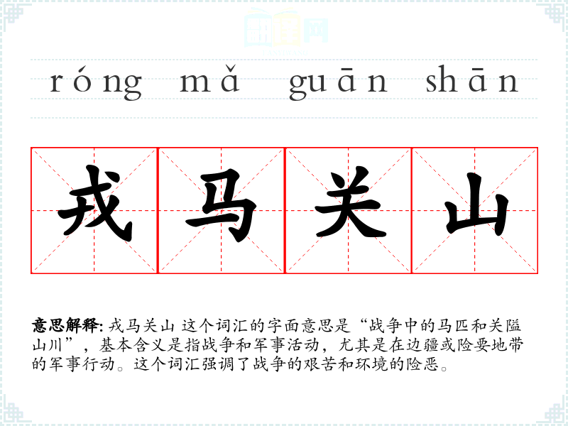 戎马关山 这个词汇的字面意思是“战争中的马匹和关隘山川”,基本含义是指战争和军事活动,尤其是在边疆或险要地带的军事行动。这个词汇强调了战争的艰苦和环境的险恶。