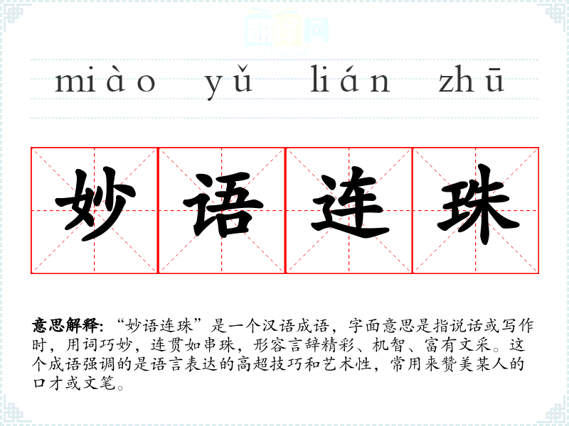 “妙语连珠”是一个汉语成语,字面意思是指说话或写作时,用词巧妙,连贯如串珠,形容言辞精彩、机智、富有文采。这个成语强调的是语言表达的高超技巧和艺术性,常用来赞美某人的口才或文笔。