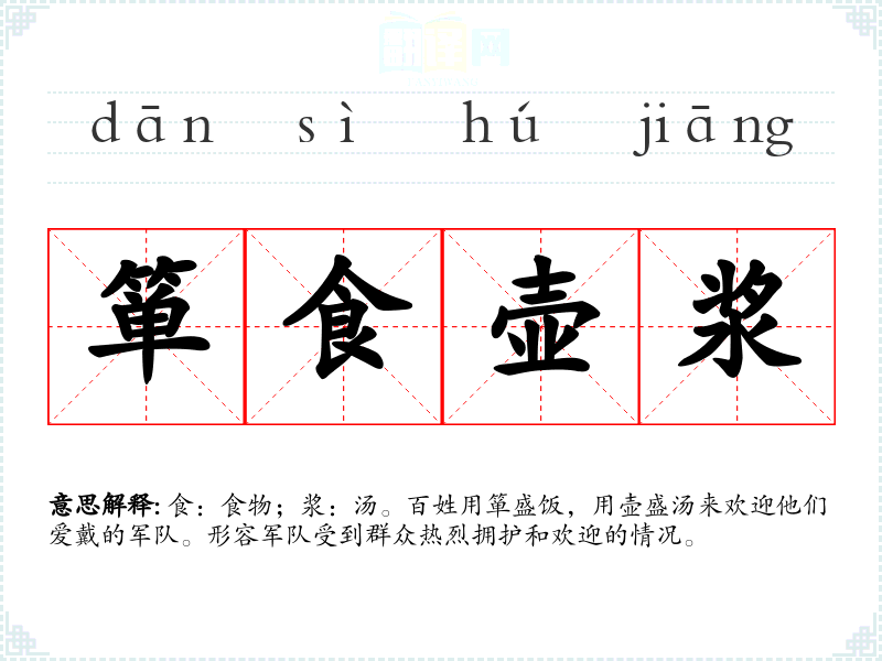 食:食物;浆:汤。百姓用箪盛饭,用壶盛汤来欢迎他们爱戴的军队。形容军队受到群众热烈拥护和欢迎的情况。