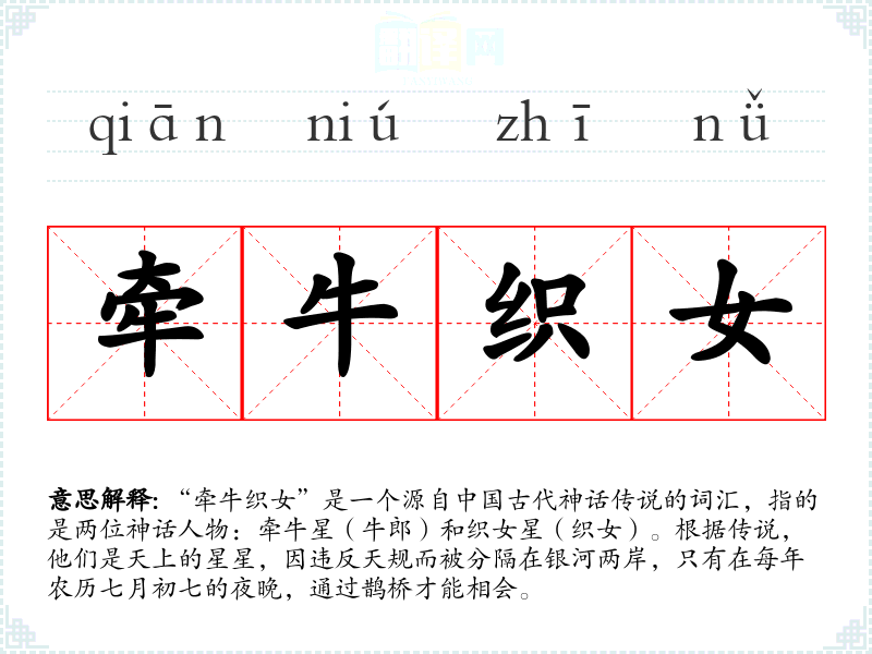 “牵牛织女”是一个源自**古代神话传说的词汇,指的是两位神话人物:牵牛星(牛郎)和织女星(织女)。根据传说,他们是天上的星星,因违反天规而被分隔在银河两岸,只有在每年农历七月初七的夜晚,通过鹊桥才能相会。