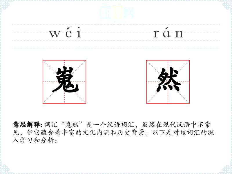 词汇“嵬然”是一个汉语词汇,虽然在现代汉语中不常见,但它蕴含着丰富的文化内涵和历史背景。以下是对该词汇的深入学*和分析: