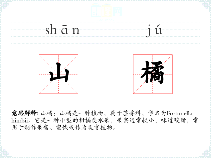 山橘:山橘是一种植物,属于芸香科,学名为Fortunella hindsii。它是一种小型的柑橘类水果,果实通常较小,味道酸甜,常用于制作果酱、蜜饯或作为观赏植物。