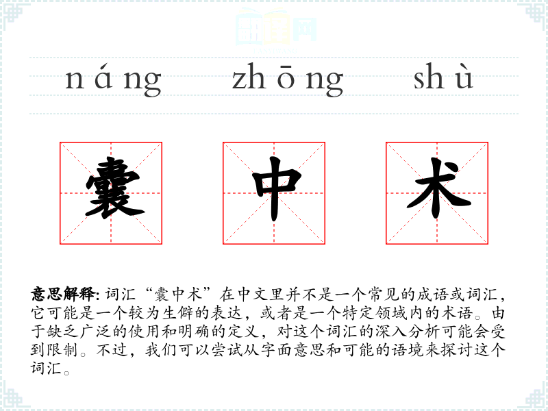 “囊中术”字面意思可能是指藏在囊中的技艺或方法。这里的“囊”通常指的是袋子,而“术”则指的是技艺、方法或技术。因此,这个词汇可能指的是某种秘密的、不为人知的技艺或方法。