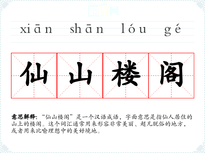 “仙山楼阁”是一个汉语成语,字面意思是指仙人居住的山上的楼阁。这个词汇通常用来形容非常美丽、超凡脱俗的地方,或者用来比喻理想中的美好境地。