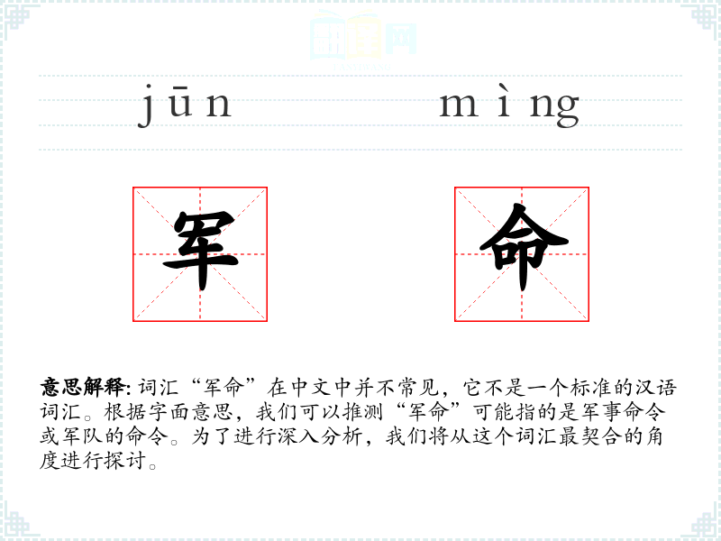 词汇“军命”在中文中并不常见,它不是一个标准的汉语词汇。根据字面意思,我们可以推测“军命”可能指的是军事命令或军队的命令。为了进行深入分析,我们将从这个词汇最契合的角度进行探讨。