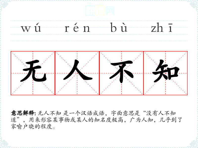 无人不知 是一个汉语成语,字面意思是“没有人不知道”,用来形容某事物或某人的知名度极高,广为人知,几乎到了家喻户晓的程度。
