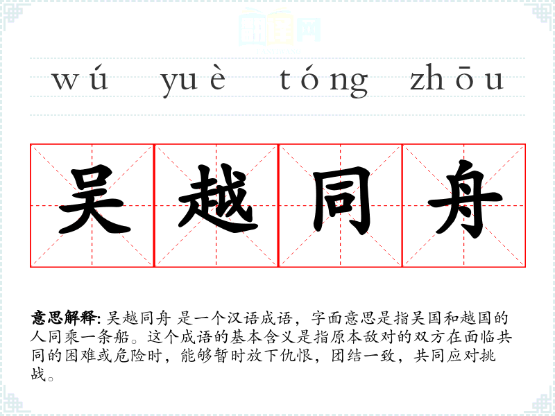 吴越同舟 是一个汉语成语,字面意思是指吴国和越国的人同乘一条船。这个成语的基本含义是指原本敌对的双方在面临共同的困难或危险时,能够暂时放下仇恨,团结一致,共同应对挑战。