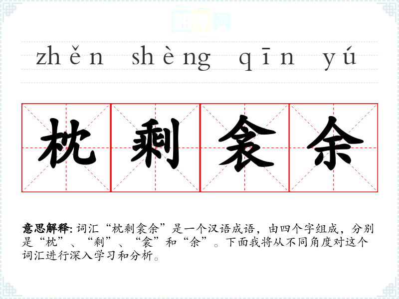 词汇“枕剩衾余”是一个汉语成语,由四个字组成,分别是“枕”、“剩”、“衾”和“余”。下面我将从不同角度对这个词汇进行深入学*和分析。