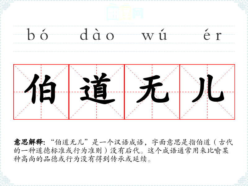 “伯道无儿”是一个汉语成语,字面意思是指伯道(古代的一种道德标准或行为准则)没有后代。这个成语通常用来比喻某种高尚的品德或行为没有得到传承或延续。