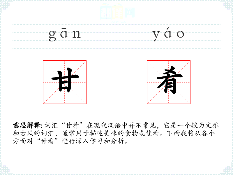 词汇“甘肴”在现代汉语中并不常见,它是一个较为文雅和古风的词汇,通常用于描述美味的食物或佳肴。下面我将从各个方面对“甘肴”进行深入学*和分析。