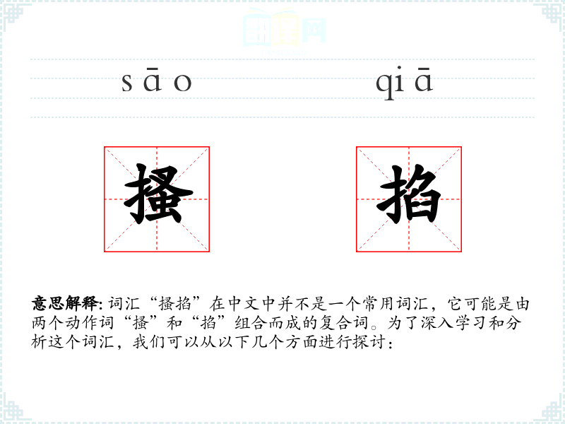 词汇“搔掐”在中文中并不是一个常用词汇,它可能是由两个动作词“搔”和“掐”组合而成的复合词。为了深入学习和分析这个词汇,我们可以从以下几个方面进行探讨: