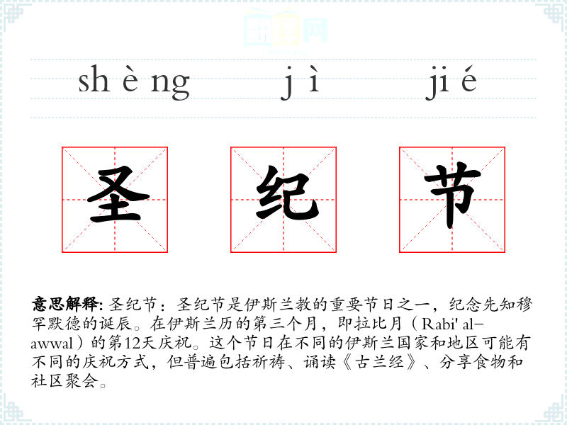 文学:在文学作品中,圣纪节可能被用来描绘伊斯兰社区的团结和热情,或者作为故事背景的一部分。 口语:在日常对话中,人们可能会讨论圣纪节的庆祝活动,分享家庭传统,或者邀请朋友参加庆祝活动。 专业领域:在研究或历史学中,圣纪节可能被用作研究伊斯兰文化和历史的切入点。