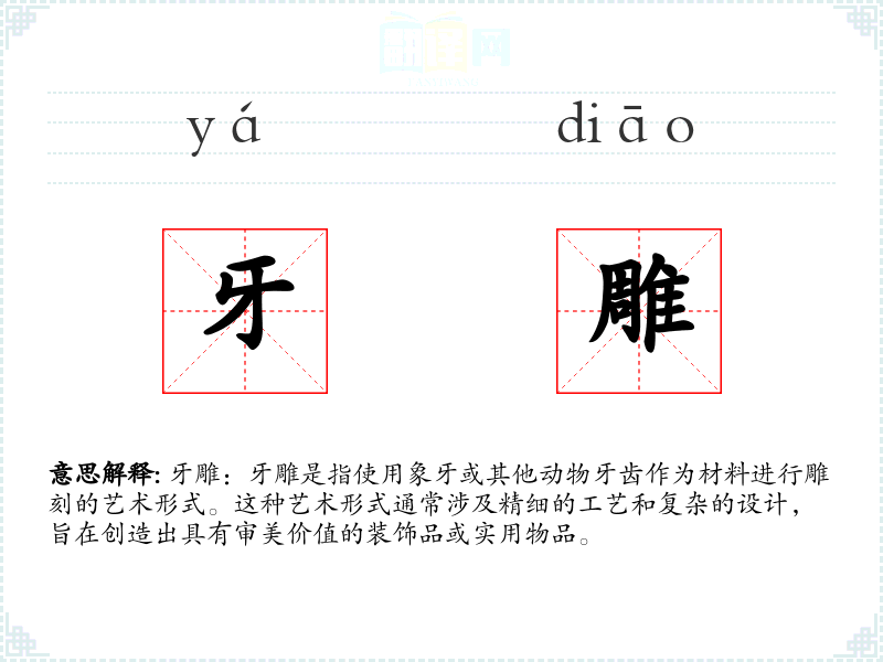 - 反义词:无(由于牙雕是一种特定的艺术形式,没有直接的反义词)
