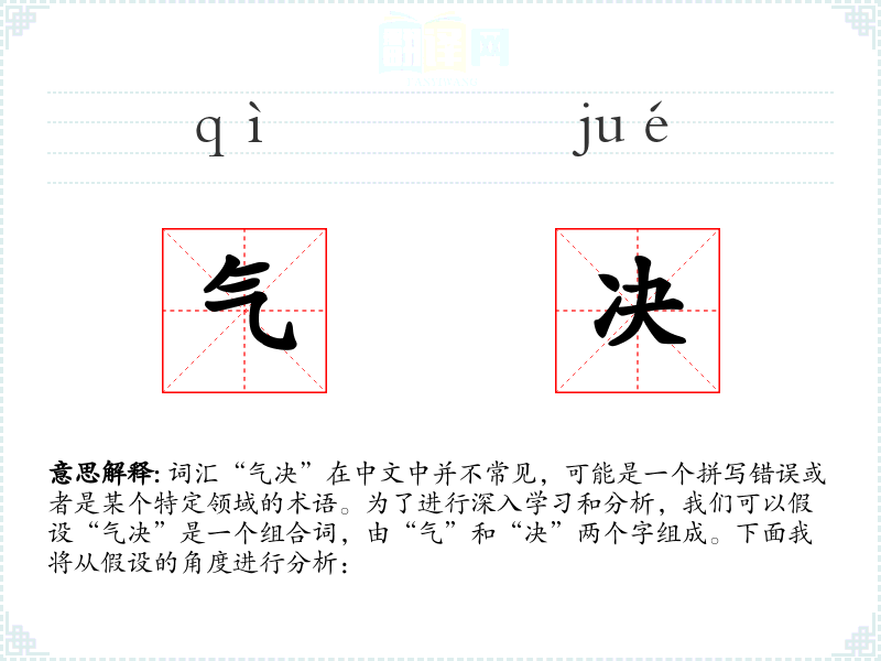 词汇“气决”在中文中并不常见,可能是一个拼写错误或者是某个特定领域的术语。为了进行深入学*和分析,我们可以假设“气决”是一个组合词,由“气”和“决”两个字组成。下面我将从假设的角度进行分析: