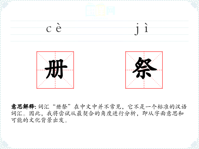 词汇“册祭”在中文中并不常见,它不是一个标准的汉语词汇。因此,我将尝试从最契合的角度进行分析,即从字面意思和可能的文化背景出发。