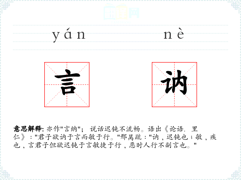 亦作"言纳"; 说话迟钝不流畅。语出《论语.里仁》﹕"君子欲讷于言而敏于行。"邢昺疏﹕"讷﹐迟钝也﹔敏﹐疾也﹐言君子但欲迟钝于言敏捷于行﹐恶时人