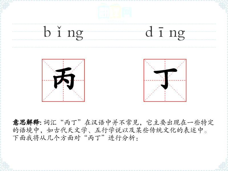 - 五行学说:在中医、风水等传统文化中,“丙丁”与火元素相关,用于描述事物的属性和相互关系。