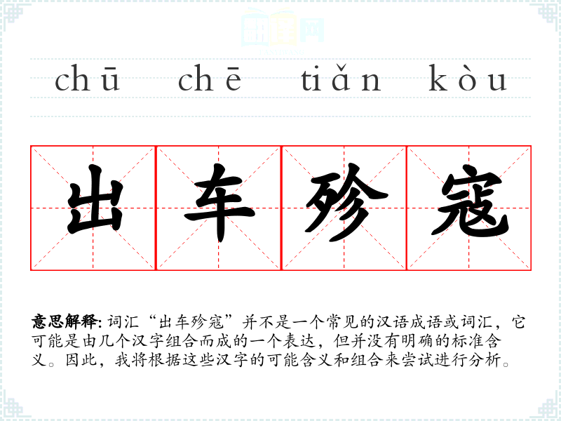 词汇“出车殄寇”并不是一个常见的汉语成语或词汇,它可能是由几个汉字组合而成的一个表达,但并没有明确的标准含义。因此,我将根据这些汉字的可能含义和组合来尝试进行分析。