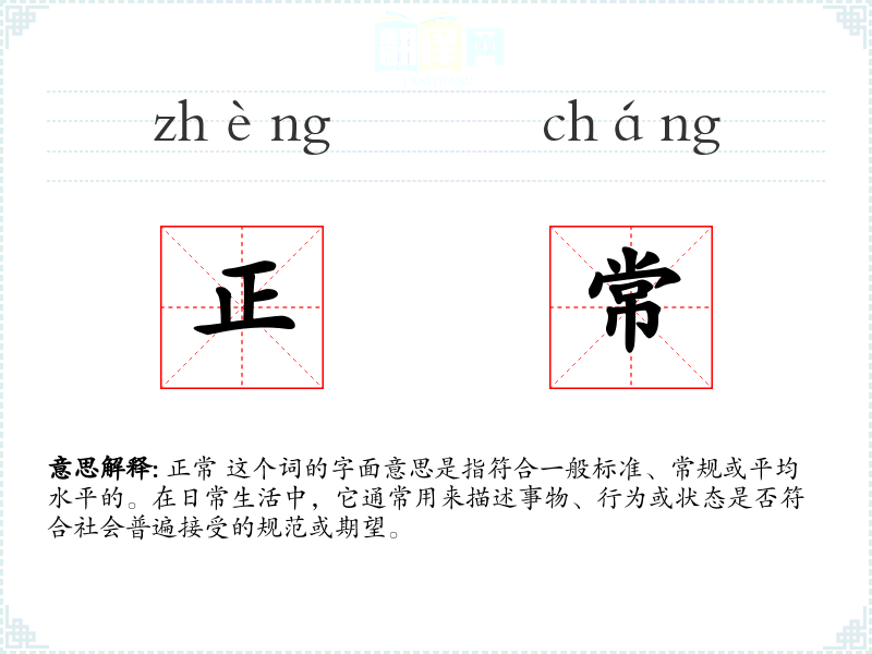 正常 这个词的字面意思是指符合一般标准、常规或平均水平的。在日常生活中,它通常用来描述事物、行为或状态是否符合社会普遍接受的规范或期望。