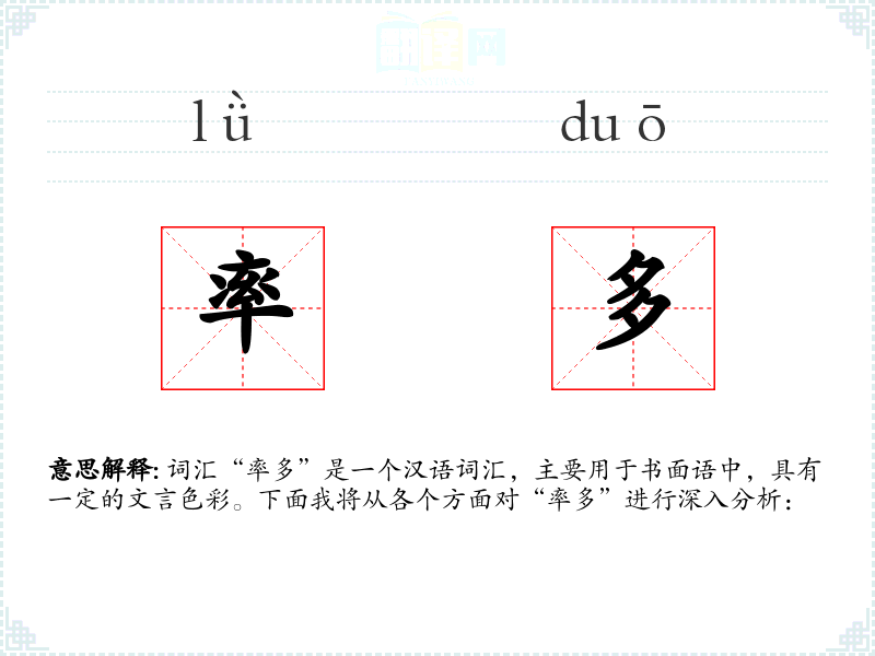- 文学语境:在文学作品中,“率多”常用于描述普遍现象或常见情况,如“古之学者,率多勤勉。”