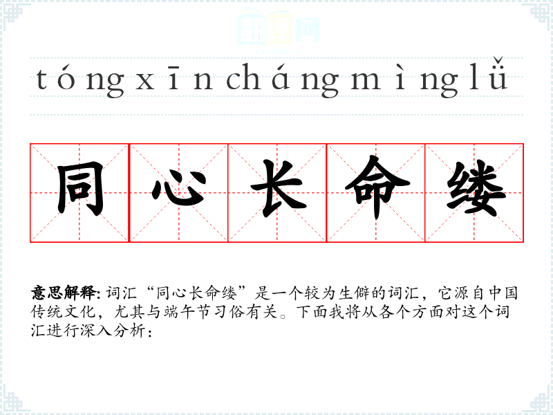词汇“同心长命缕”是一个较为生僻的词汇,它源自*传统文化,尤其与端午节俗有关。下面我将从各个方面对这个词汇进行深入分析: