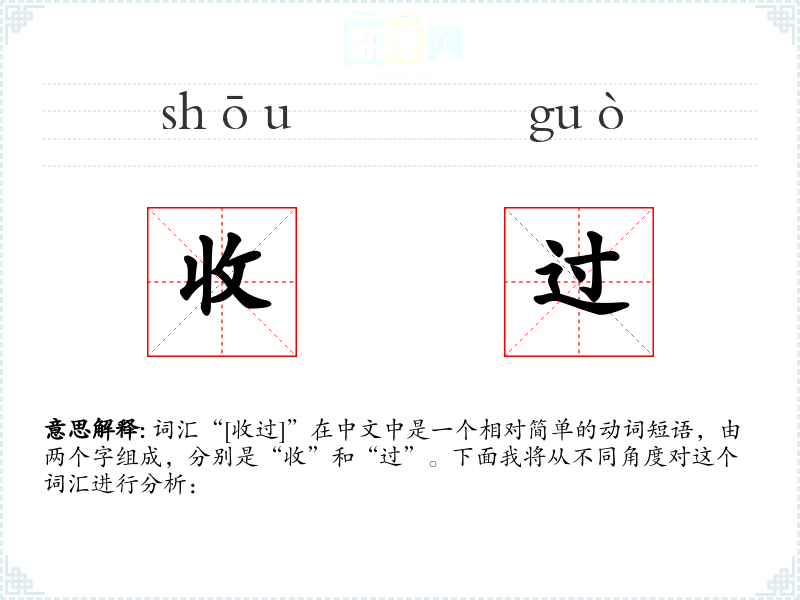 词汇“[收过]”在中文中是一个相对简单的动词短语,由两个字组成,分别是“收”和“过”。下面我将从不同角度对这个词汇进行分析: