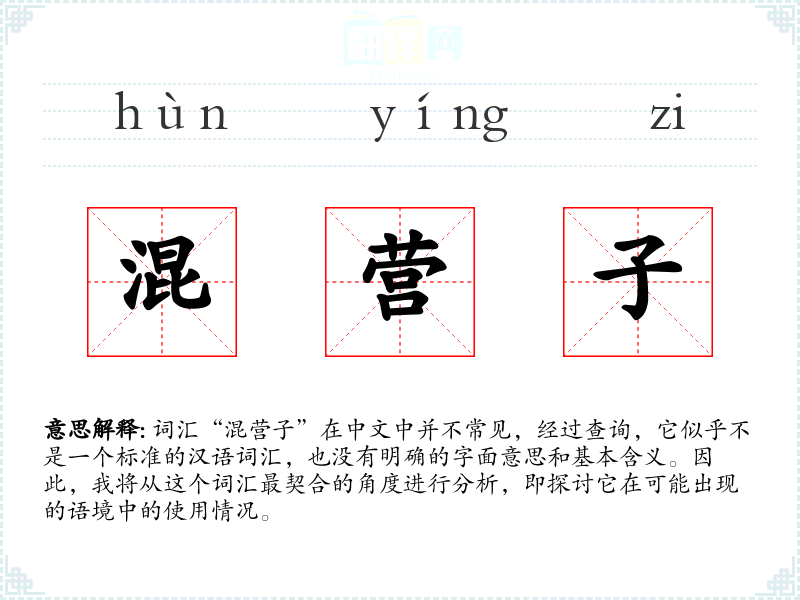 由于“混营子”不是一个标准词汇,我们无法给出确切的基本定义。它可能是某个方言词汇或者是某个特定社群中的俚语。