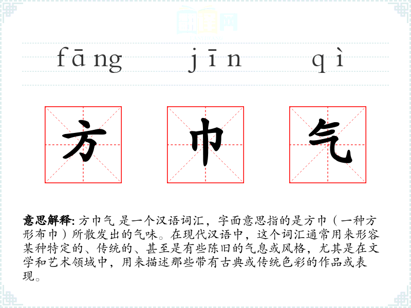 方巾气 是一个汉语词汇,字面意思指的是方巾(一种方形布巾)所散发出的气味。在现代汉语中,这个词汇通常用来形容某种特定的、传统的、甚至是有些陈旧的气息或风格,尤其是在文学和艺术领域中,用来描述那些带有古典或传统色彩的作品或表现。