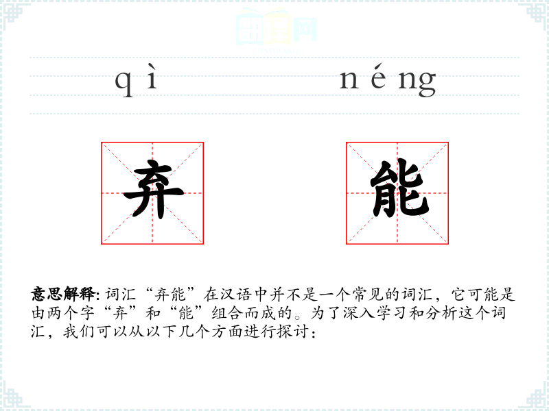 “弃能”作为一个组合词汇,其含义和使用需要根据具体语境来确定。在语言学*和表达中,了解和掌握这样的词汇可以帮助我们更准确地表达特定的概念和情感。通过对“弃能”的分析,我们可以更好地理解词汇的多义性和灵活性。