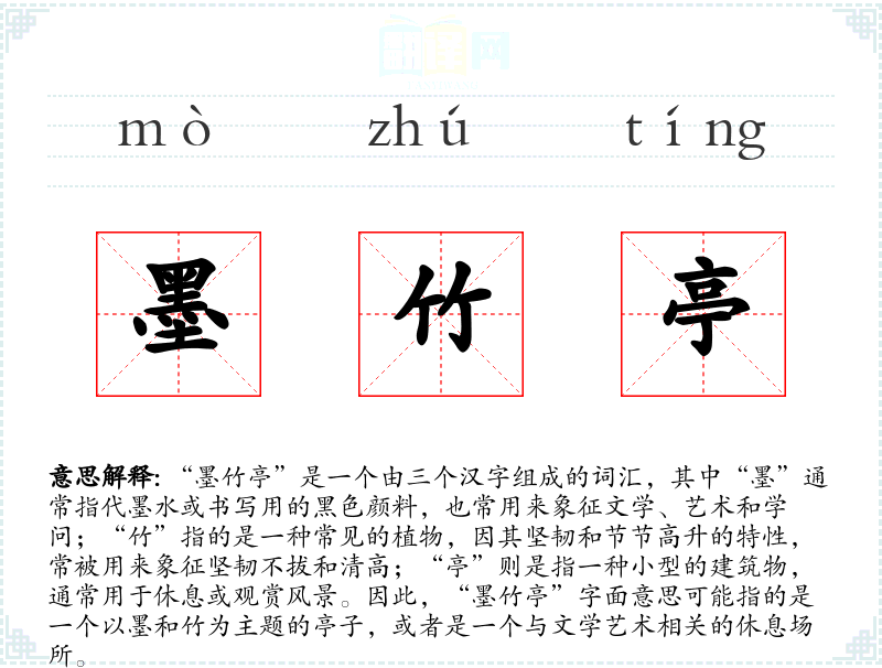 “墨竹亭”是一个由三个汉字组成的词汇,其中“墨”通常指代墨水或书写用的黑色颜料,也常用来象征文学、艺术和学问;“竹”指的是一种常见的植物,因其坚韧和节节高升的特性,常被用来象征坚韧不拔和清高;“亭”则是指一种小型的建筑物,通常用于休息或观赏风景。因此,“墨竹亭”字面意思可能指的是一个以墨和竹为主题的亭子,或者是一个与文学艺术相关的休息场所。