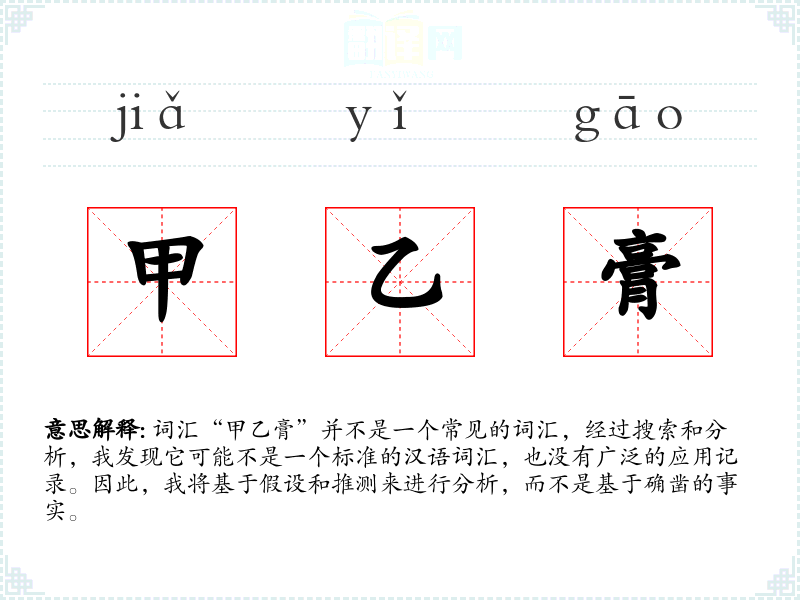词汇“甲乙膏”并不是一个常见的词汇,经过搜索和分析,我发现它可能不是一个标准的汉语词汇,也没有广泛的应用记录。因此,我将基于假设和推测来进行分析,而不是基于确凿的事实。
