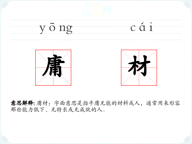 庸材:字面意思是指平庸无能的材料或人,通常用来形容那些能力低下、无特长或无成就的人。