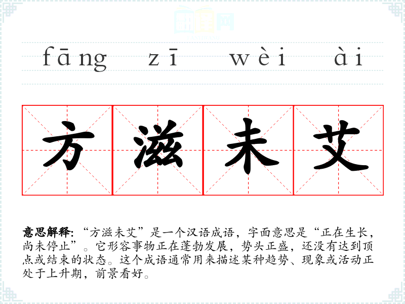 “方滋未艾”是一个汉语成语,字面意思是“正在生长,尚未停止”。它形容事物正在蓬勃发展,势头正盛,还没有达到顶点或结束的状态。这个成语通常用来描述某种趋势、现象或活动正处于上升期,前景看好。