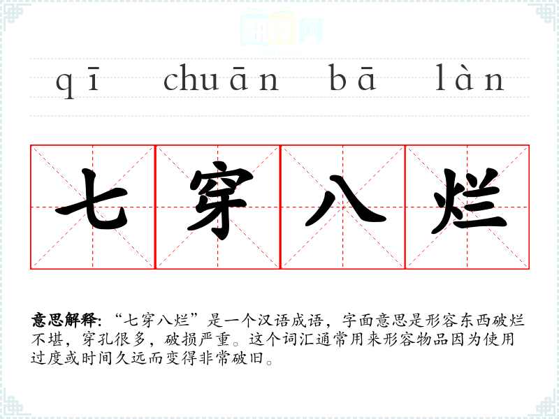 “七穿八烂”是一个汉语成语,字面意思是形容东西破烂不堪,穿孔很多,破损严重。这个词汇通常用来形容物品因为使用过度或时间久远而变得非常破旧。