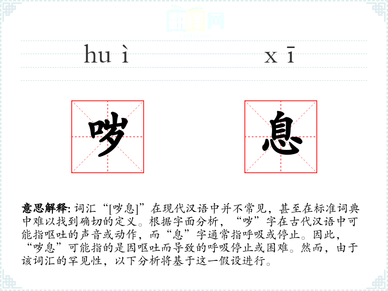 词汇“[哕息]”在现代汉语中并不常见,甚至在标准词典中难以找到确切的定义。根据字面分析,“哕”字在古代汉语中可能指呕吐的声音或动作,而“息”字通常指呼吸或停止。因此,“哕息”可能指的是因呕吐而导致的呼吸停止或困难。然而,由于该词汇的罕见性,以下分析将基于这一假设进行。