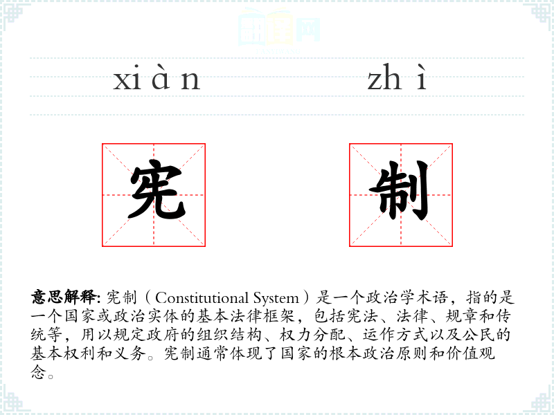 宪制(Constitutional System)是一个政治学术语,指的是一个国家或政治实体的基本法律框架,包括宪法、法律、规章和传统等,用以规定政府的组织结构、权力分配、运作方式以及公民的基本权利和义务。宪制通常体现了国家的根本政治原则和价值观念。