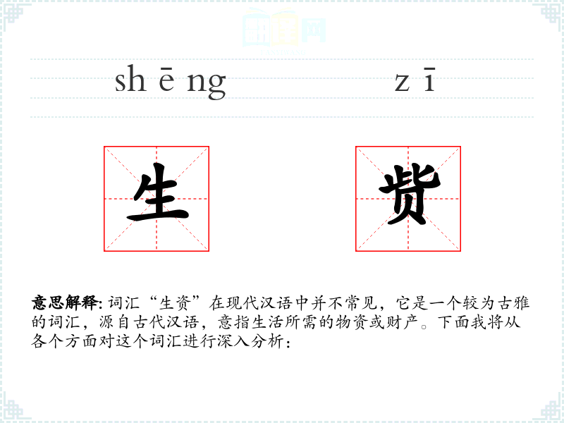 词汇“生资”在现代汉语中并不常见,它是一个较为古雅的词汇,源自古代汉语,意指生活所需的物资或财产。下面我将从各个方面对这个词汇进行深入分析: