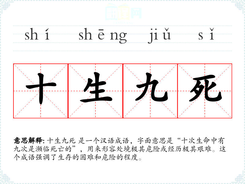 十生九死 是一个汉语成语,字面意思是“十次生命中有九次是濒临死亡的”,用来形容处境极其危险或经历极其艰难。这个成语强调了生存的困难和危险的程度。