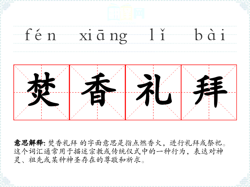 焚香礼拜 的字面意思是指点燃香火,进行礼拜或祭祀。这个词汇通常用于描述**或传统仪式中的一种行为,表达对神灵、祖先或某种神圣存在的尊敬和祈求。