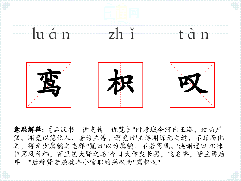 1.《后汉书.循吏传.仇览》"时考城令河内王涣,政尚严猛,闻览以德化人,署为主簿。谓览曰'主簿闻陈元之过,不罪而化之,得无少鹰鹯之志邪?'览曰'以为鹰鹯,不若鸾凤。'涣谢遣曰'枳棘非鸾凤所栖,百里岂大贤之路?今日太学曳长裾,飞名誉,皆主簿后耳。'"后称贤者屈就卑小官职的感叹为"鸾枳叹"。