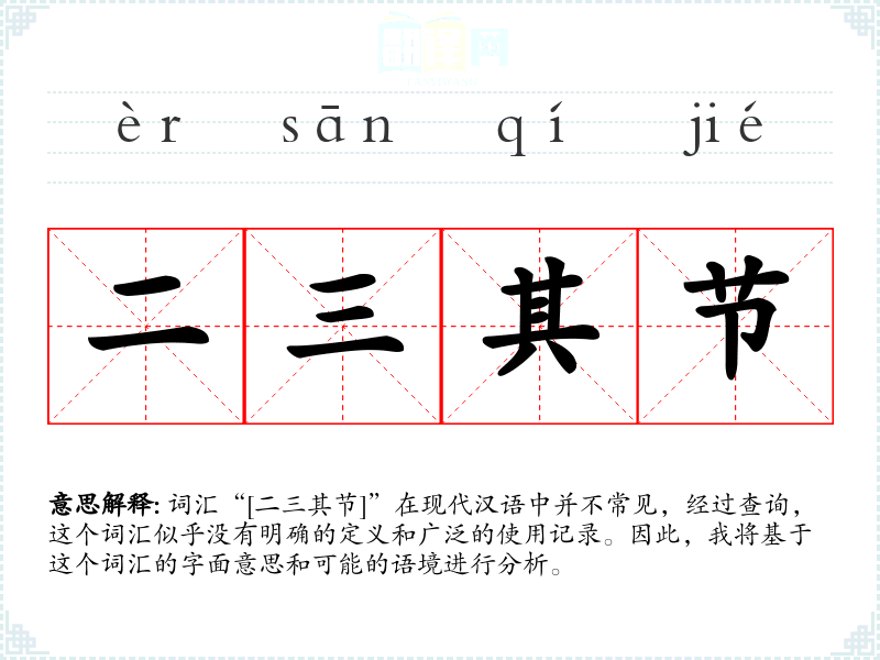 “二三其节”这个词汇在现代汉语中并不常见,其具体含义和使用场景难以确定。在语言学习和表达中,了解和掌握常用词汇更为重要。对于不常见的词汇,可以通过更多的语料库研究和实际应用来加深理解。