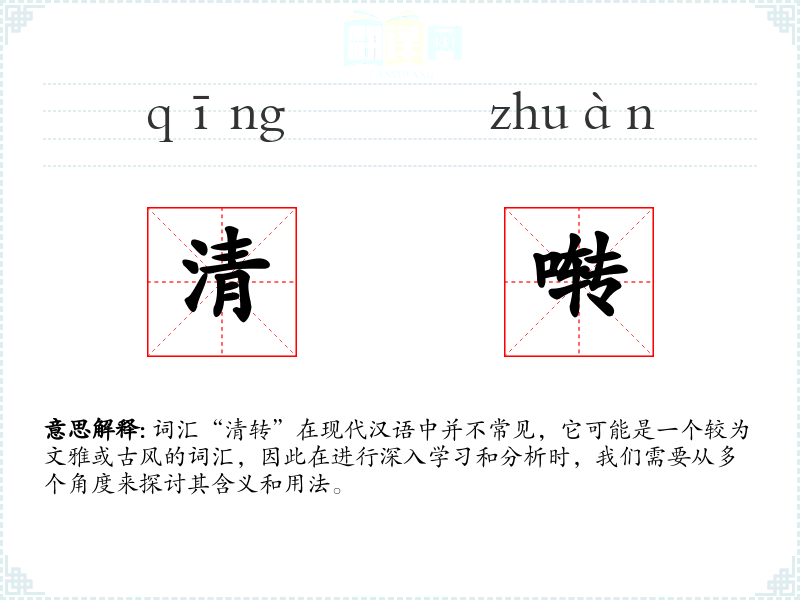 词汇“清转”在现代汉语中并不常见,它可能是一个较为文雅或古风的词汇,因此在进行深入学*和分析时,我们需要从多个角度来探讨其含义和用法。
