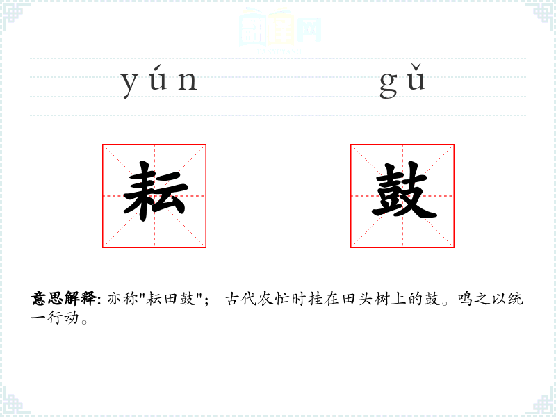亦称"耘田鼓"; 古代农忙时挂在田头树上的鼓。鸣之以统一行动。
