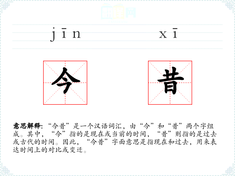 - 反义词:无直接反义词,但“今”与“昔”本身可以视为一对反义词