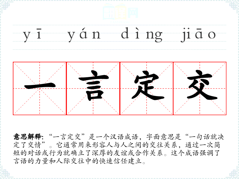 “一言定交”是一个汉语成语,字面意思是“一句话就决定了交情”。它通常用来形容人与人之间的交往关系,通过一次简短的对话或行为就确立了深厚的友谊或合作关系。这个成语强调了言语的力量和人际交往中的快速信任建立。
