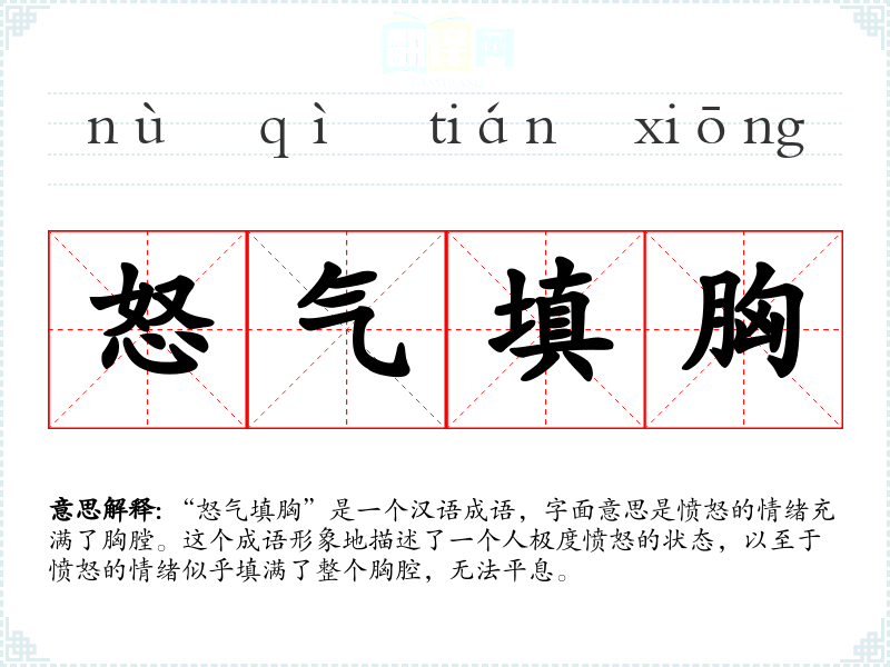 在**文化中,愤怒被视为一种强烈的情感反应,通常与正义感或对不公的反抗联系在一起。因此,“怒气填胸”这个成语在描述正义感强烈的情境时尤为常见。