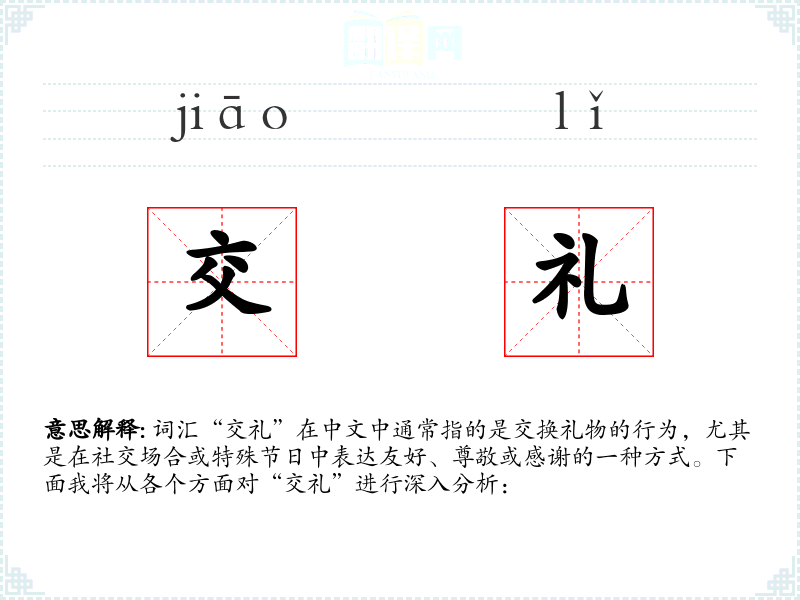 - 反义词:无,因为“交礼”是一个正面的社交行为,没有直接的反义词。