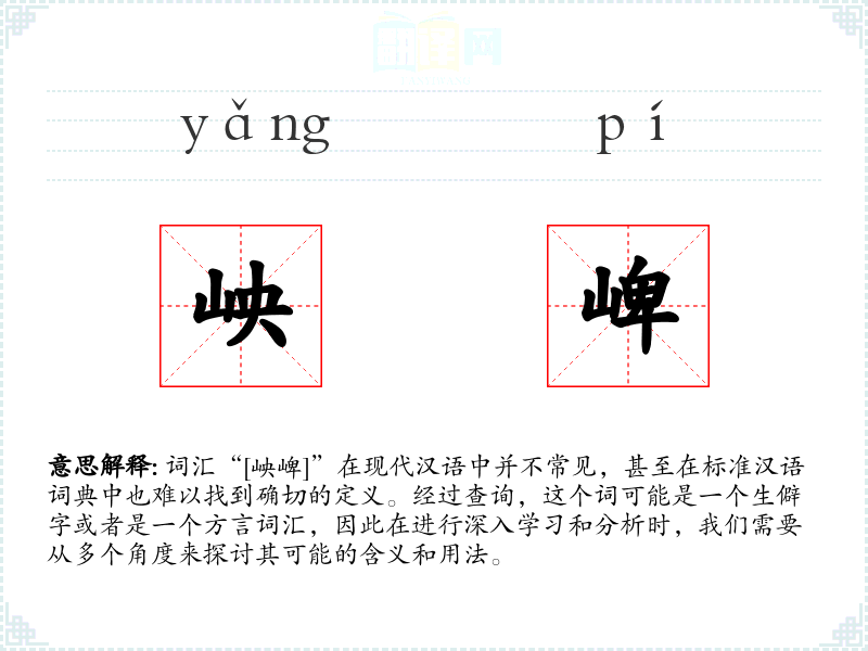 词汇“[岟崥]”在现代汉语中并不常见,甚至在标准汉语词典中也难以找到确切的定义。经过查询,这个词可能是一个生僻字或者是一个方言词汇,因此在进行深入学习和分析时,我们需要从多个角度来探讨其可能的含义和用法。